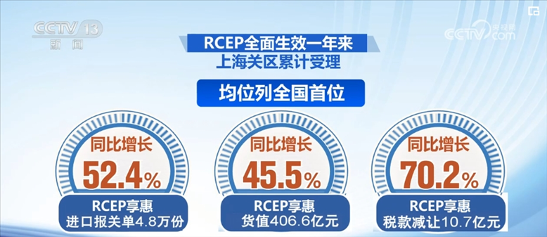 在上海,RCEP全面生效一年來,上海關區(qū)累計受理RCEP享惠進口報關單4.8萬份,貨值406.6億元,稅款減讓10.7億元,均位列全國首位,同比分別增長52.4%、45.5%和70.2%,