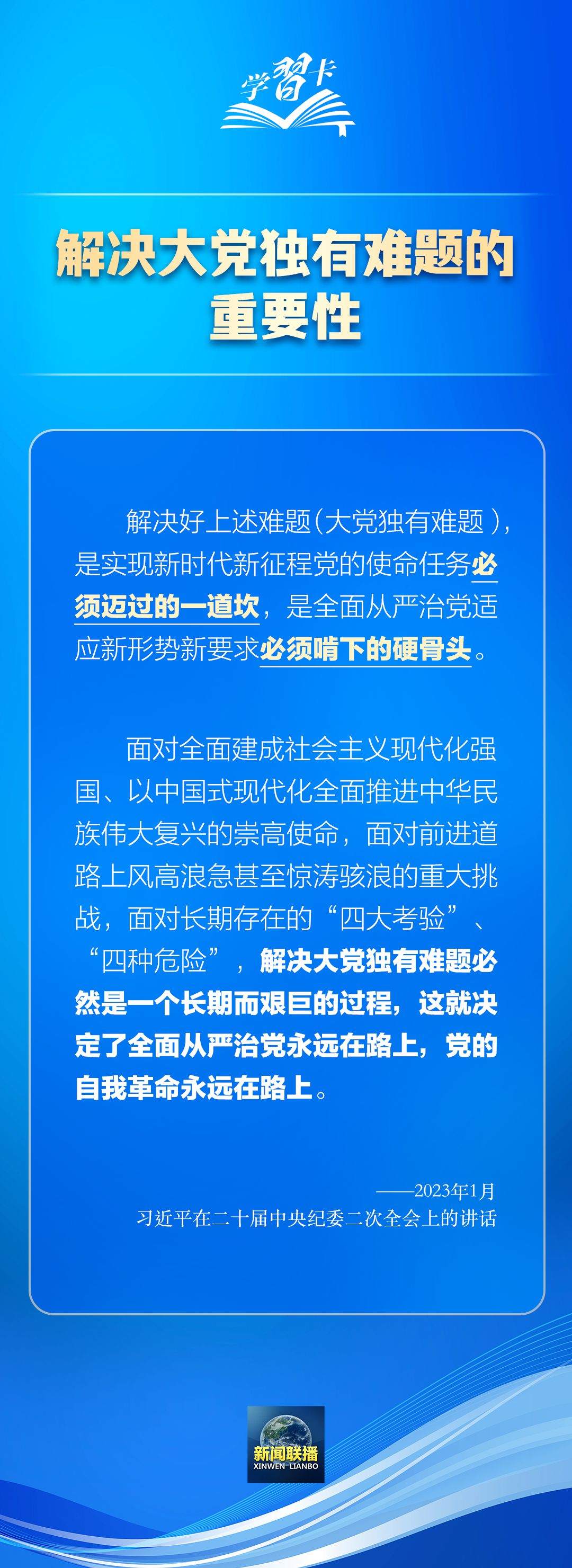 習(xí)近平總書記在不同場合多次強(qiáng)調(diào)全面從嚴(yán)治黨、黨的自我革命的重要性。解決好大黨獨有難題,是實現(xiàn)新時代新征程黨的使命任務(wù)必須邁過的一道坎,是全面從嚴(yán)治黨適應(yīng)新形勢新要求必須啃下的硬骨頭。