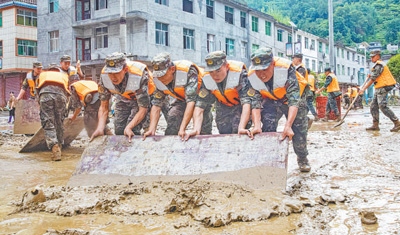 武警重慶總隊(duì)執(zhí)勤第五支隊(duì)官兵在重慶市黔江區(qū)白石鎮(zhèn)天河村清理道路上的淤泥。王湛銘攝(新華社發(fā))