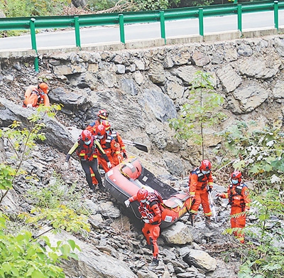 湖北省消防救援總隊(duì)前突小組黨員突擊隊(duì)在陜西省商洛市腰坪水庫(kù)開(kāi)展搜救。圖為消防救援人員運(yùn)送橡皮艇至作業(yè)水域。亓玉昆 李偉男攝影報(bào)道