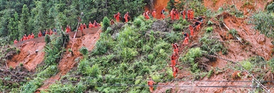 湖南省郴州市資興市八面山瑤族鄉(xiāng),消防救援人員穿越山體滑坡路段,徒步前往受災(zāi)地區(qū)。李 科攝(人民視覺(jué))