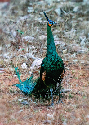 云南楚雄雙柏縣恐龍河自然保護(hù)區(qū)的綠孔雀(2023年4月20日攝)胡超攝/本刊