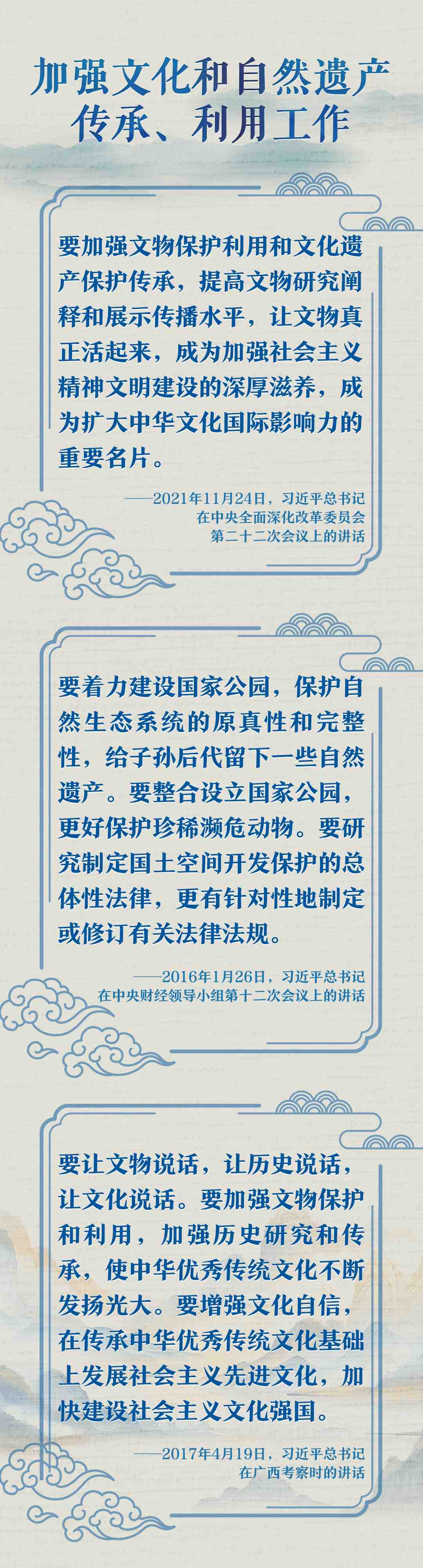 文化遺產(chǎn)體現(xiàn)了中華民族旺盛的生命力和創(chuàng)造力,自然遺產(chǎn)昭示了神奇的自然造化同中華民族的和諧依存關(guān)系。習(xí)近平總書記一直以來(lái)高度重視文化和自然遺產(chǎn)保護(hù)傳承利用工作,近日專門就此作出重要指示強(qiáng)調(diào),守護(hù)好中華民族的文化瑰寶和自然珍寶,讓文化和自然遺產(chǎn)在新時(shí)代煥發(fā)新活力綻放新光彩。讓我們一同學(xué)習(xí)。
