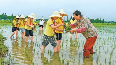 圖為學(xué)生們?cè)隗w驗(yàn)插秧。王棟棟攝