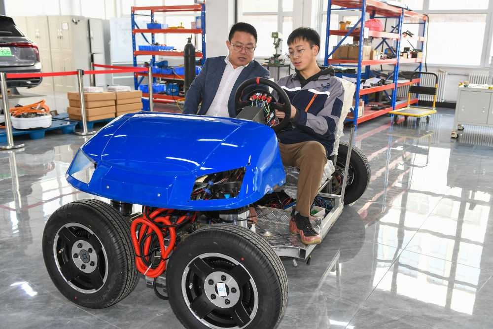 2024年3月13日,在吉林長春一家汽車科技企業(yè),吉林大學(xué)汽車工程學(xué)院教授靳立強(qiáng)(左)試乘智能底盤樣車。2023年,長春市科技局和吉林大學(xué)共建吉林大學(xué)概念驗(yàn)證中心,一手對接高校,一手對接企業(yè),確??蒲谐晒诩夹g(shù)路線和商業(yè)模式上的可行性,實(shí)現(xiàn)“從0到1”的轉(zhuǎn)化。