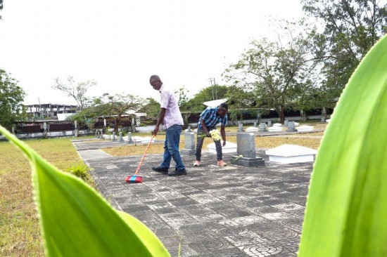 8月12日,姆薩菲里·奧馬里(右)和同事在援坦中國專家公墓打掃。