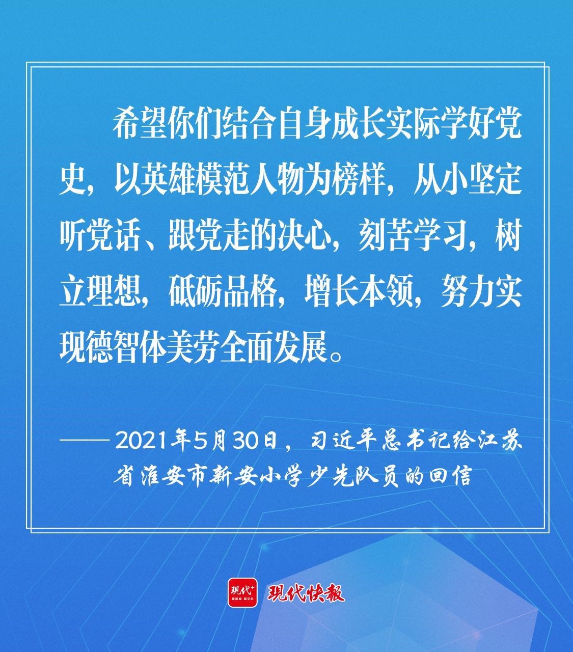 2021年5月30日,習(xí)近平總書記給江蘇省淮安市新安小學(xué)少先隊員回信時強調(diào),“希望你們結(jié)合自身成長實際學(xué)好黨史,以英雄模范人物為榜樣,從小堅定聽黨話、跟黨走的決心,刻苦學(xué)習(xí),樹立理想,砥礪品格,增長本領(lǐng),努力實現(xiàn)德智體美勞全面發(fā)展。”