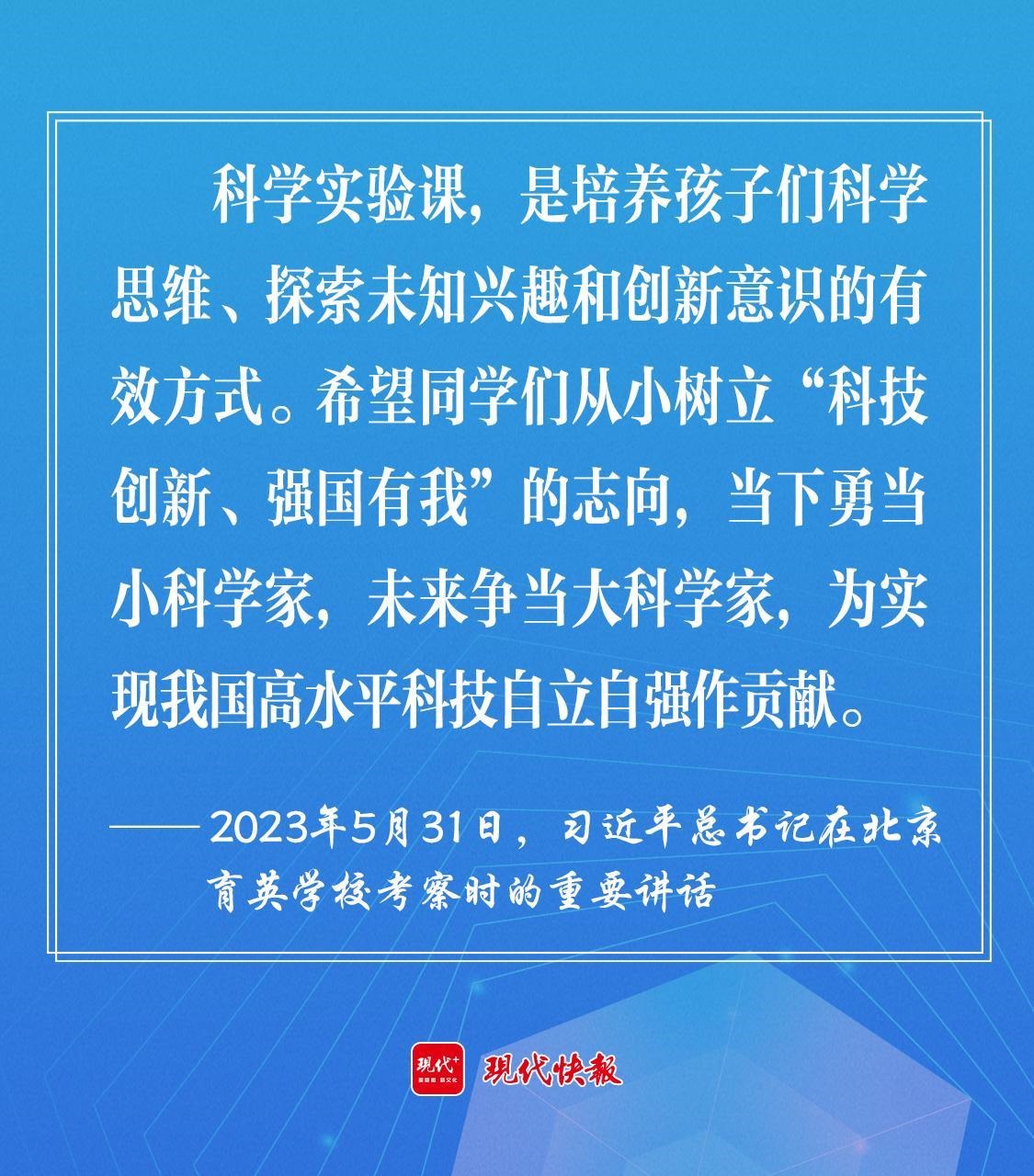 2023年5月,習(xí)近平總書記在北京育英學(xué)??疾鞎r強調(diào),希望同學(xué)們從小樹立“科技創(chuàng)新、強國有我”的志向,當(dāng)下勇當(dāng)小科學(xué)家,未來爭當(dāng)大科學(xué)家,為實現(xiàn)我國高水平科技自立自強作貢獻(xiàn)。