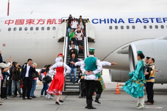 9月28日,東航“上海-喀山”直飛首航航班的旅客抵達(dá)俄羅斯韃靼斯坦共和國喀山國際機場。新華社記者 曹陽 攝