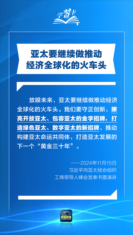 習近平指出,過去30年,亞太地區(qū)經濟保持了強勁增長,創(chuàng)造了舉世矚目的“亞太奇跡”。如何推動構建亞太命運共同體,打造亞太發(fā)展的下一個“黃金三十年”?習主席強調了一個關鍵詞:經濟全球化。一起學習↓