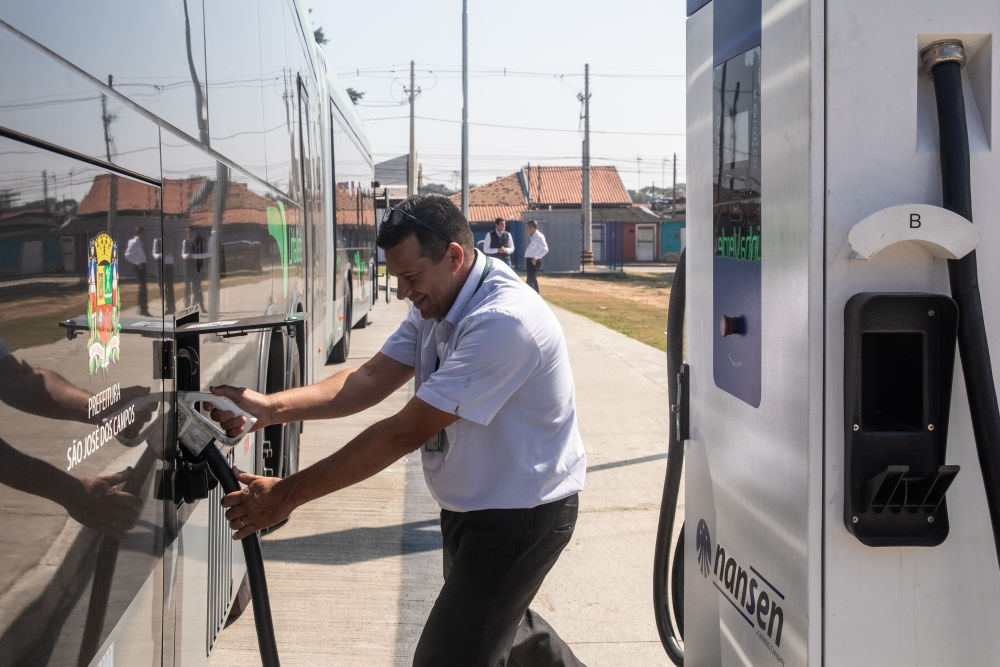 2021年11月,12臺(tái)中國(guó)制造的純電動(dòng)鉸鏈?zhǔn)酱蟀驮诎臀骱教斐恰ト魸啥潘箍财账辜冸娍焖俟幌到y(tǒng)投用。這是2023年7月12日,工作人員為中國(guó)制造的純電動(dòng)大巴充電。