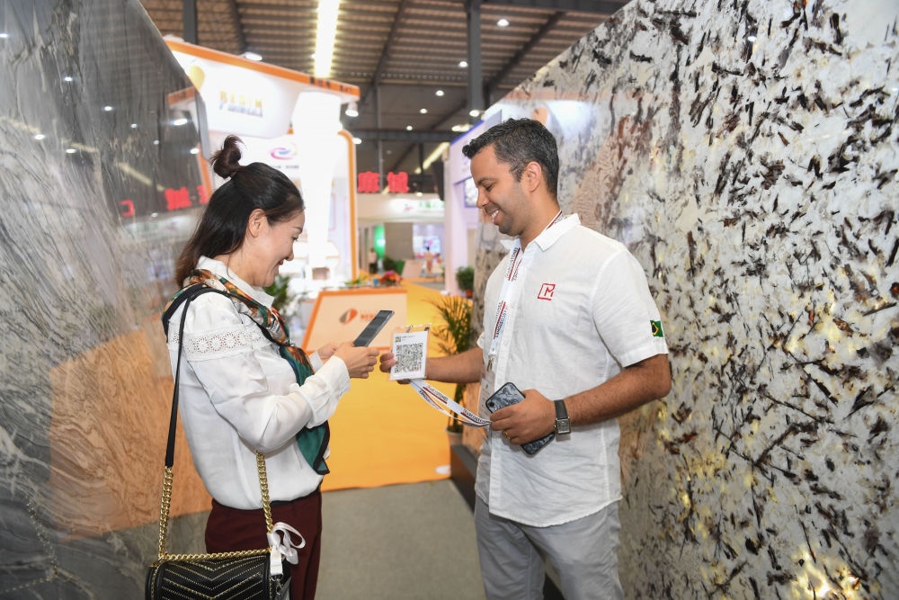 2019年11月8日,巴西商人馬庫(kù)斯在福建省南安市水頭鎮(zhèn)舉辦的國(guó)際石材博覽會(huì)上向國(guó)內(nèi)客商出示自己的微信二維碼。