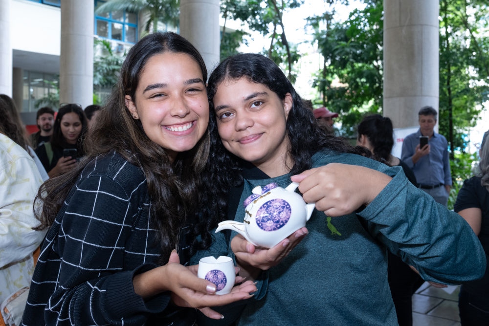 2024年4月18日,在巴西里約熱內(nèi)盧舉行的聯(lián)合國(guó)中文日活動(dòng)上,巴西學(xué)生手持中國(guó)工藝品合影。
