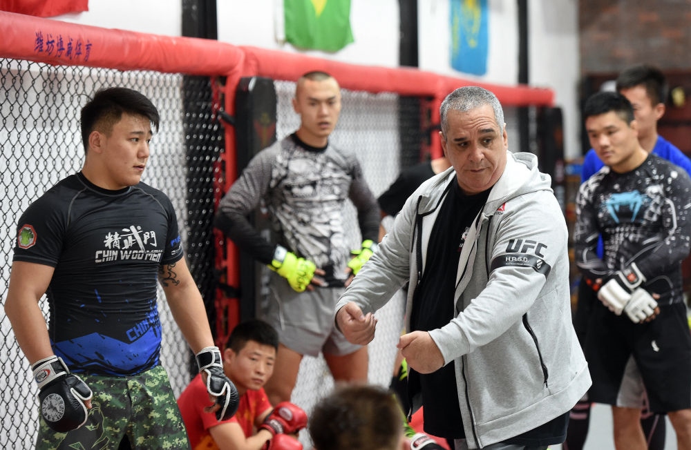 2019年11月6日,來(lái)自巴西里約熱內(nèi)盧的柔術(shù)教練魯伊·梅內(nèi)賽斯在北京一家搏擊館講解動(dòng)作要領(lǐng)。