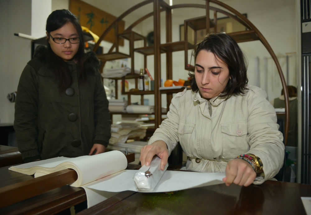 2012年12月20日,巴西留學(xué)生瑪麗安娜(右)在杭州一家藝術(shù)館體驗(yàn)傳統(tǒng)木版水印技藝。