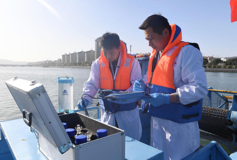 2024年11月28日,在淅川縣鸛河流域城區(qū)段,南陽(yáng)市生態(tài)環(huán)境局淅川分局工作人員記錄采樣水質(zhì)情況。