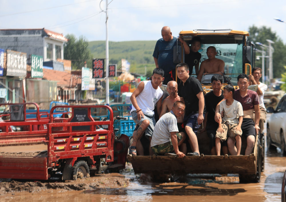 2024年8月21日,葫蘆島市建昌縣部分受災居民乘鏟車轉(zhuǎn)移。