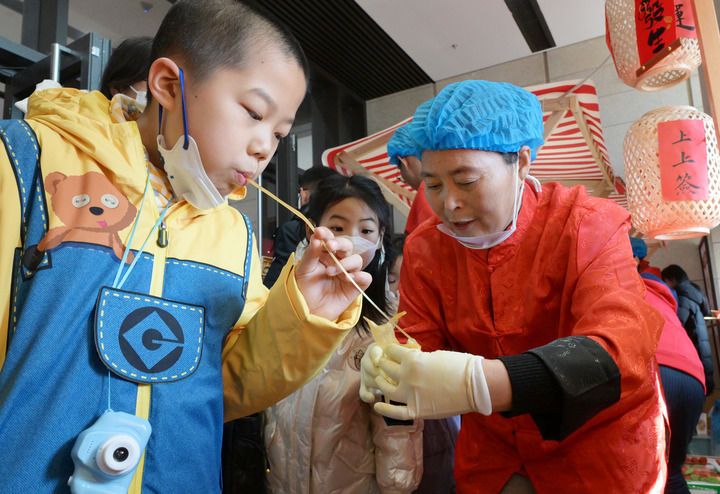 2025年1月29日,小朋友在位于北京的中國非物質(zhì)文化遺產(chǎn)館舉行的“過年——春節(jié)主題展”上體驗(yàn)“吹糖人”。新華社記者 李賀 攝