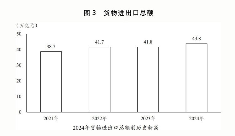 (六)加快建設(shè)更高水平開放型經(jīng)濟(jì)新體制,高水平對外開放取得積極成效。全年貨物進(jìn)出口總額43.8萬億元,服務(wù)進(jìn)出口總額7.5萬億元,外商直接投資1162億美元,境外直接投資1438億美元。年末外匯儲備規(guī)模達(dá)32024億美元。