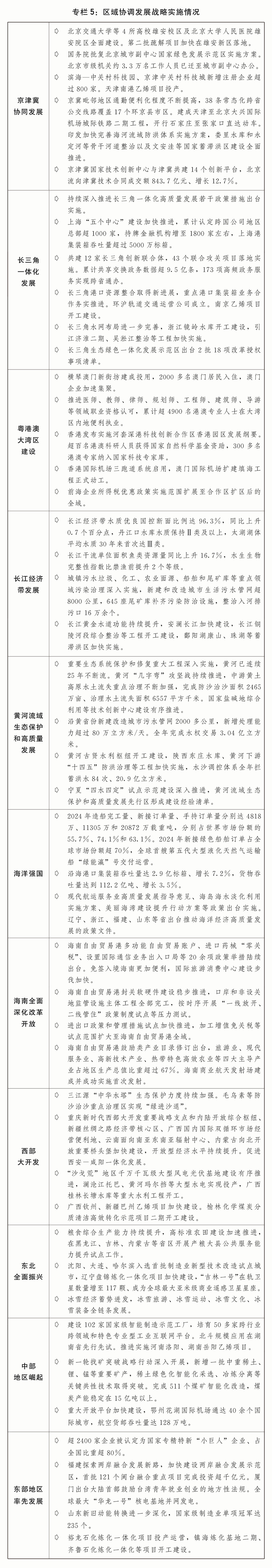 一是區(qū)域協(xié)調(diào)發(fā)展積厚成勢。京津冀協(xié)同發(fā)展走深走實,在京相關(guān)高校、醫(yī)院、中央企業(yè)總部及二三級子公司分批向雄安新區(qū)疏解,北京城市副中心行政辦公、商務(wù)服務(wù)、文化旅游等功能不斷完善,進(jìn)一步支持天津濱海新區(qū)高質(zhì)量發(fā)展若干政策措施出臺實施,三省市互聯(lián)互通交通網(wǎng)絡(luò)更加完善、產(chǎn)業(yè)鏈上下游協(xié)作持續(xù)強化、公共服務(wù)共建共享水平進(jìn)一步提升。長三角一體化高質(zhì)量發(fā)展深入推進(jìn),生態(tài)綠色一體化發(fā)展示范區(qū)改革授權(quán)壓茬推進(jìn),港口資源整合、軌道互聯(lián)互通等取得新進(jìn)展,上?!拔鍌€中心”建設(shè)進(jìn)一步加快。粵港澳大灣區(qū)建設(shè)邁上新臺階,橫琴粵澳深度合作區(qū)封關(guān)“一線”“二線”分線管理運行順利,超1.6萬名澳門居民在合作區(qū)居住生活,支持河套深港科技創(chuàng)新合作區(qū)深圳園區(qū)、香港園區(qū)聯(lián)動發(fā)展,創(chuàng)新要素跨境流動更加便捷。長江經(jīng)濟(jì)帶共抓大保護(hù)、不搞大開發(fā)成效顯著,進(jìn)一步抓實抓好長江大保護(hù)工作三年行動計劃出臺實施,長江十年禁漁取得明顯成效,長江干流連續(xù)5年保持Ⅱ類水質(zhì),綜合立體交通走廊加快構(gòu)建,沿江高鐵全線開工建設(shè)。黃河流域生態(tài)保護(hù)和高質(zhì)量發(fā)展邁出堅實步伐,農(nóng)業(yè)面源、城鎮(zhèn)生活、工業(yè)和尾礦庫污染治理深入推進(jìn),8萬余個入河排污口開展溯源整治,一批生態(tài)保護(hù)修復(fù)重點項目加快建設(shè),黃河干流連續(xù)3年保持Ⅱ類水質(zhì)。海洋強國建設(shè)深入推進(jìn),海洋強省、現(xiàn)代海洋城市、全國海洋經(jīng)濟(jì)發(fā)展示范區(qū)創(chuàng)新發(fā)展,海洋生態(tài)環(huán)境質(zhì)量持續(xù)改善,海洋生產(chǎn)總值超10萬億元。