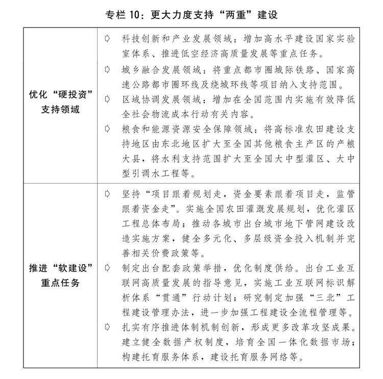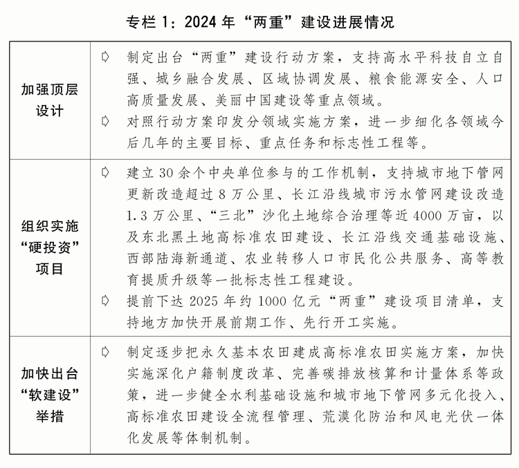 三是加力推進(jìn)“兩重”建設(shè)。進(jìn)一步完善自上而下的工作機(jī)制,加強“兩重”建設(shè)項目儲備,更好統(tǒng)籌“硬投資”與“軟建設(shè)”。安排超長期特別國債8000億元支持“兩重”建設(shè),進(jìn)一步優(yōu)化具體投向并提高項目支持比例,重點支持基礎(chǔ)研究能力提升、未來產(chǎn)業(yè)發(fā)展、東北等重點地區(qū)高標(biāo)準(zhǔn)農(nóng)田建設(shè)、大中型灌區(qū)新建改造及大中型引調(diào)水和大中型水庫建設(shè)、長江經(jīng)濟(jì)帶生態(tài)環(huán)境保護(hù)和綠色發(fā)展、農(nóng)業(yè)轉(zhuǎn)移人口市民化公共服務(wù)體系建設(shè)、高等教育提質(zhì)升級、城市地下管網(wǎng)管廊建設(shè)改造等方面任務(wù),強化超長期貸款等配套融資,高質(zhì)量推進(jìn)“硬投資”項目謀劃實施。加大力度推動“軟建設(shè)”政策落地見效。