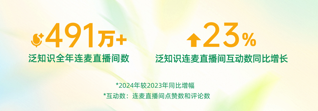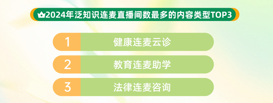 隨著用戶互動(dòng)與創(chuàng)作者投稿形成正向循環(huán),推動(dòng)生態(tài)雙向繁榮,連麥學(xué)習(xí)正重塑知識(shí)普惠的全新范式。數(shù)據(jù)顯示,2024年,快手泛知識(shí)連麥直播場(chǎng)次達(dá)491萬(wàn)場(chǎng),直播間互動(dòng)量同比提升23%,健康咨詢、教育助學(xué)、法律咨詢位列連麥內(nèi)容前三?! ?/p>