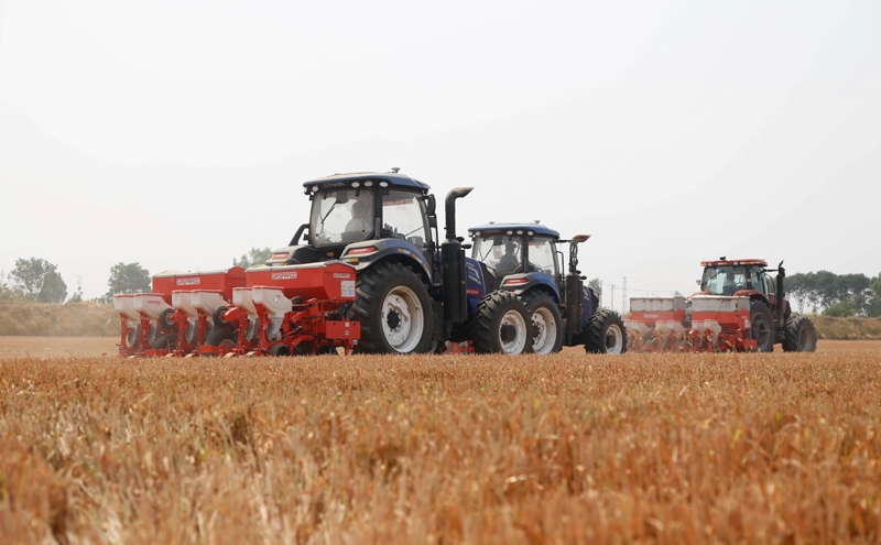 6月13日,在河北省邢臺市南和區(qū)史召鄉(xiāng)北高五村,農(nóng)民駕駛農(nóng)機播種玉米。