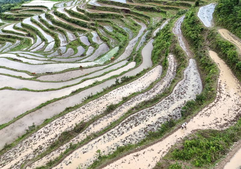 6月14日,在浙江省永嘉縣茗岙鄉(xiāng)梯田,農(nóng)民進行水稻插秧準備工作(無人機照片)。