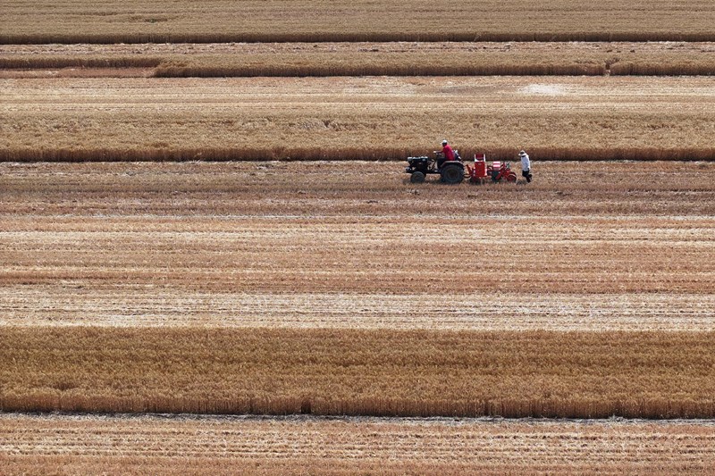 6月10日,在山東省聊城市茌平區(qū)博平鎮(zhèn)任何村,農(nóng)民駕駛農(nóng)機播種玉米(無人機照片)。