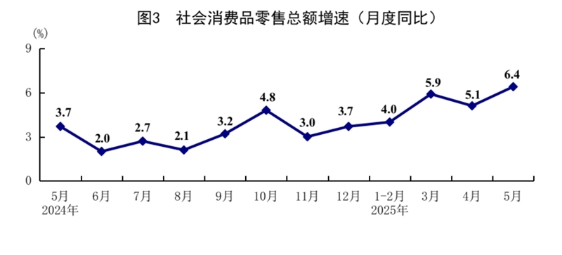 5月份,社會消費品零售總額41326億元,同比增長6.4%,比上月加快1.3個百分點;環(huán)比增長0.93%。按經(jīng)營單位所在地分,城鎮(zhèn)消費品零售額36057億元,同比增長6.5%;鄉(xiāng)村消費品零售額5269億元,增長5.4%。按消費類型分,商品零售額36748億元,增長6.5%;餐飲收入4578億元,增長5.9%?;旧铑惡筒糠稚夘惿唐蜂N售增勢較好,限額以上單位糧油食品類、金銀珠寶類、體育娛樂用品類商品零售額分別增長14.6%、21.8%、28.3%。消費品以舊換新政策持續(xù)顯效,限額以上單位家用電器和音像器材類、通訊器材類、文化辦公用品類、家具類商品零售額分別增長53.0%、33.0%、30.5%、25.6%。1—5月份,社會消費品零售總額203171億元,同比增長5.0%。全國網(wǎng)上零售額60402億元,同比增長8.5%。其中,實物商品網(wǎng)上零售額49878億元,增長6.3%,占社會消費品零售總額的比重為24.5%。1—5月份,服務(wù)零售額同比增長5.2%。