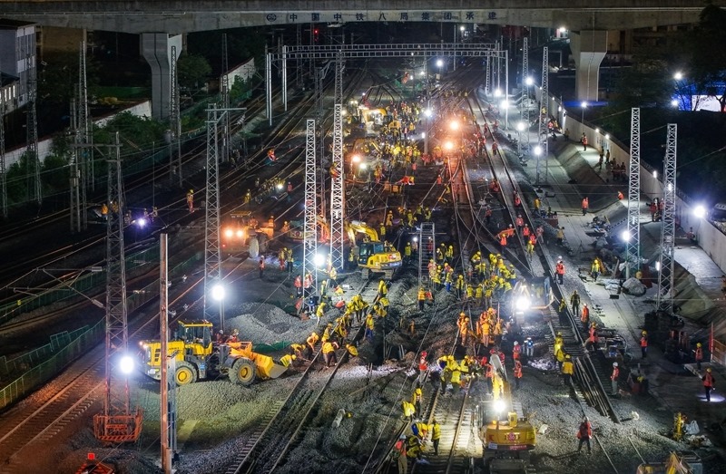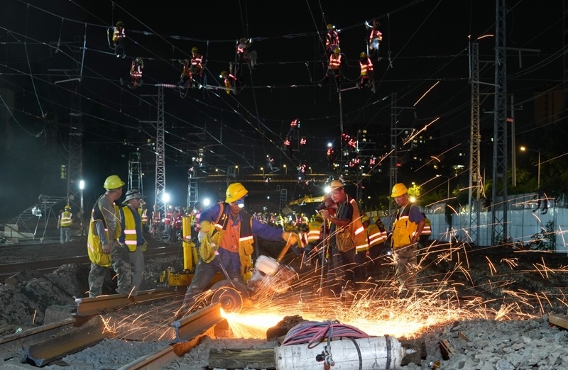 6月19日,在成渝中線高鐵成都站南北站場(chǎng)交替施工現(xiàn)場(chǎng),中鐵八局施工人員在拆除原來的軌道和枕木,上方中國(guó)中鐵電氣化局的施工人員在進(jìn)行接觸網(wǎng)施工作業(yè)。