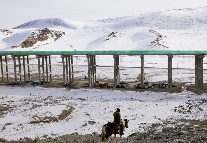 2024年12月30日,在新疆和靜縣,牧民騎馬從在建的新疆烏尉(烏魯木齊至尉犁)高速公路附近經(jīng)過(guò)。新華社記者 王菲 攝