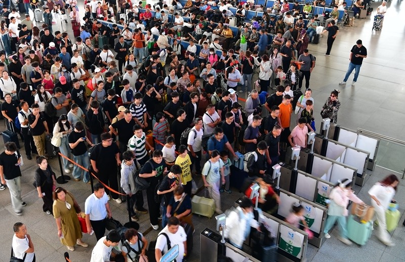 9月29日,旅客在江蘇無錫站候車大廳排隊檢票。