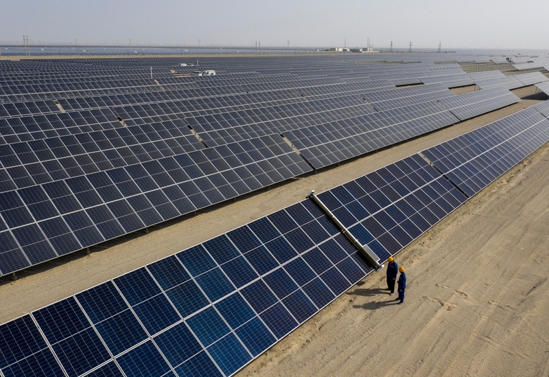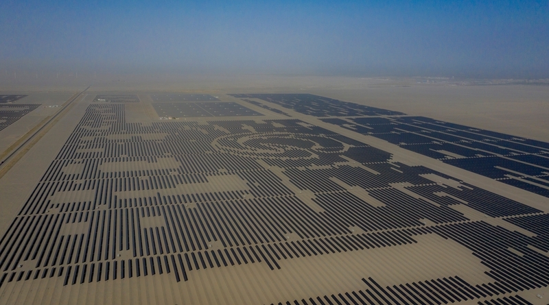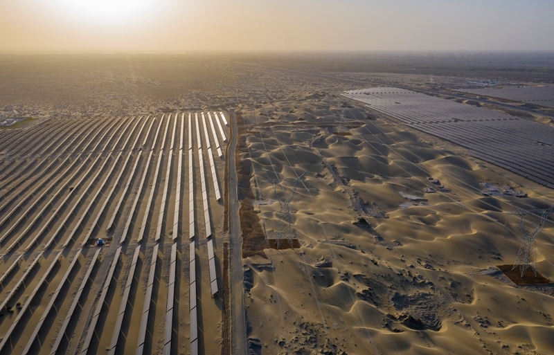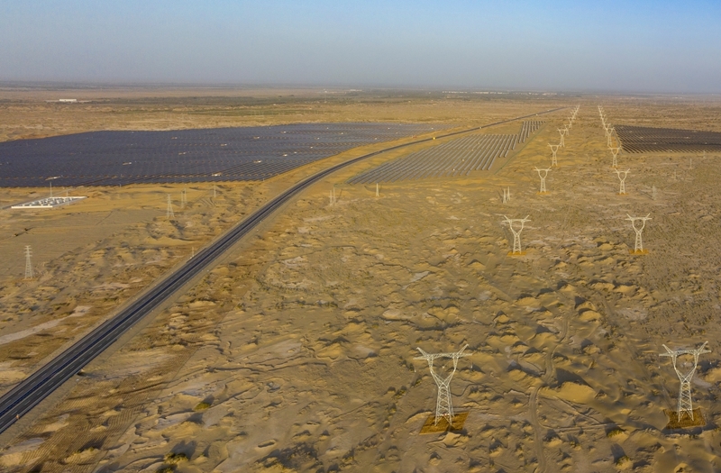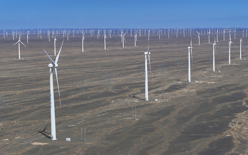 昔日的戈壁荒漠,如今由太陽能光伏板匯聚成“藍(lán)色海洋”,由風(fēng)力發(fā)電機(jī)組成“白色森林”,正孕育著無限“風(fēng)光”。