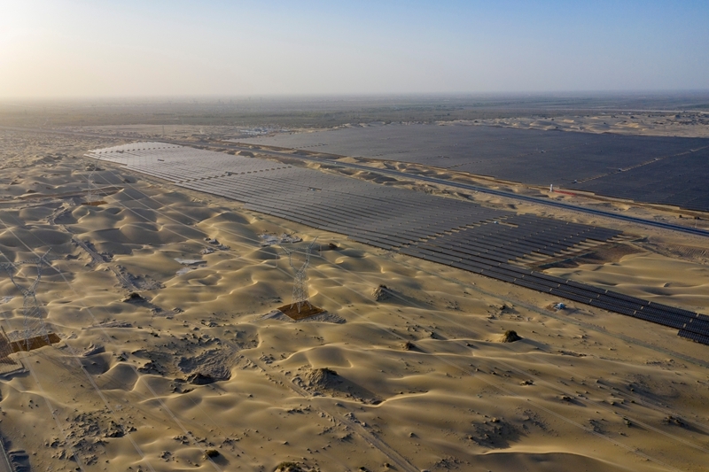 9月22日在新疆巴音郭楞蒙古自治州若羌縣拍攝的中國綠發(fā)新疆中綠電若羌400萬千瓦光伏項(xiàng)目(無人機(jī)照片)。該項(xiàng)目每年可發(fā)電69.08億千瓦時(shí),滿足南疆200萬戶家庭用電需求。