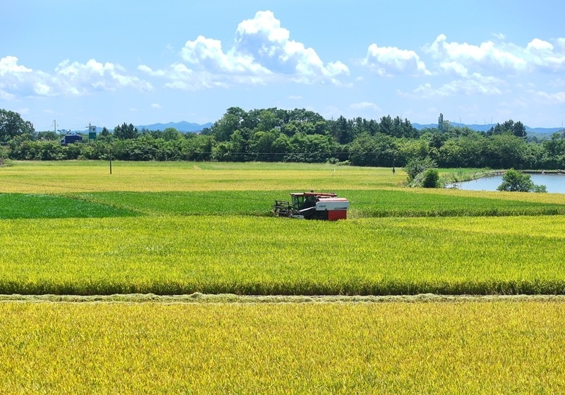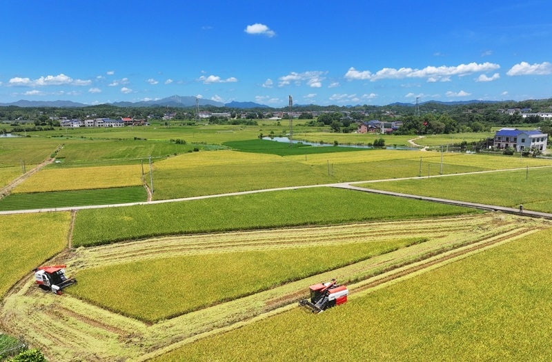 湖南省衡陽市衡山縣種植的早稻次第成熟進入收割季,當地村民搶抓晴好天氣駕駛農機收割早稻。