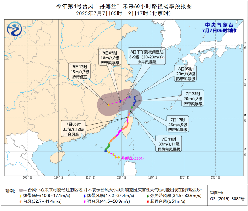 預(yù)計(jì),“丹娜絲”將以每小時15~20公里的速度向北偏東方向移動,強(qiáng)度逐漸減弱;8日早晨起轉(zhuǎn)向西偏南方向移動,逐漸向浙江臺州至福建福州一帶沿??拷?,并于8日下午到夜間在上述沿海登陸(8~9級,18~23米/秒,熱帶風(fēng)暴級)。7月7日08時至8日08時,南海東部和西南部的部分海域、臺灣海峽、臺灣以東洋面、巴士海峽、東海南部及釣魚島附近海域、福建沿海、浙江沿海、上海沿海、臺灣島沿海將有6~8級風(fēng),陣風(fēng)9~10級,其中東海西南部、臺灣海峽北部、臺灣以東洋面部分海域風(fēng)力有9~10級,陣風(fēng)11~12級,“丹娜絲”中心經(jīng)過的附近海域風(fēng)力可達(dá)11~12級、陣風(fēng)13~14級。中央氣象臺7月7日06時繼續(xù)發(fā)布臺風(fēng)黃色預(yù)警。