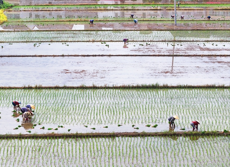 7月13日,湖南省衡陽市衡東縣霞流鎮(zhèn)農(nóng)民在搶插晚稻(無人機照片)。