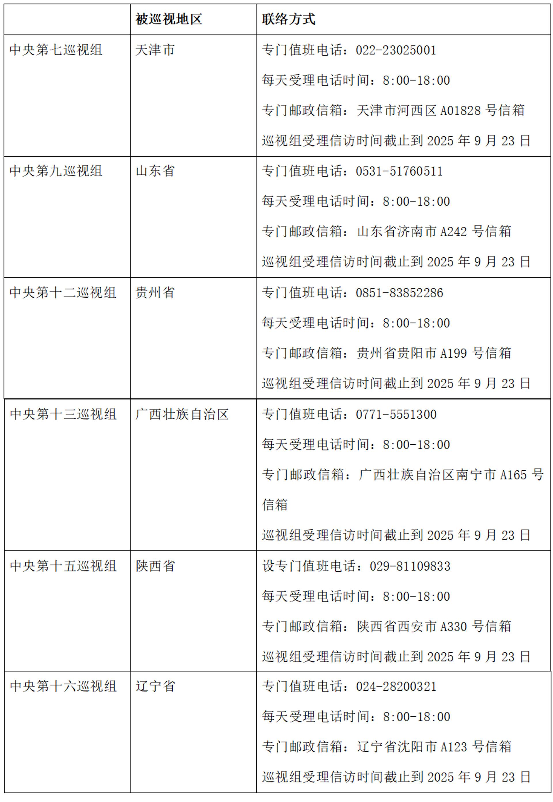 已進(jìn)駐中央巡視組聯(lián)絡(luò)方式: