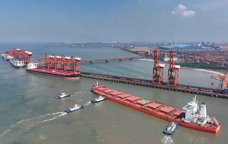 7月18日,一艘輪船靠泊在唐山港曹妃甸港區(qū)礦石碼頭卸載礦物(無(wú)人機(jī)照片)。