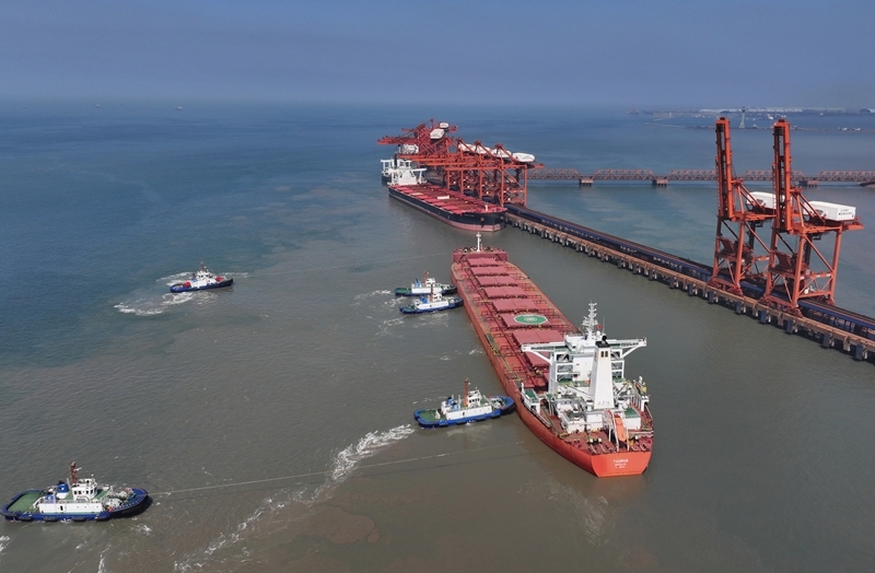 7月18日,輪船在拖輪的協(xié)助下向唐山港曹妃甸港區(qū)礦石碼頭靠泊(無(wú)人機(jī)照片)。