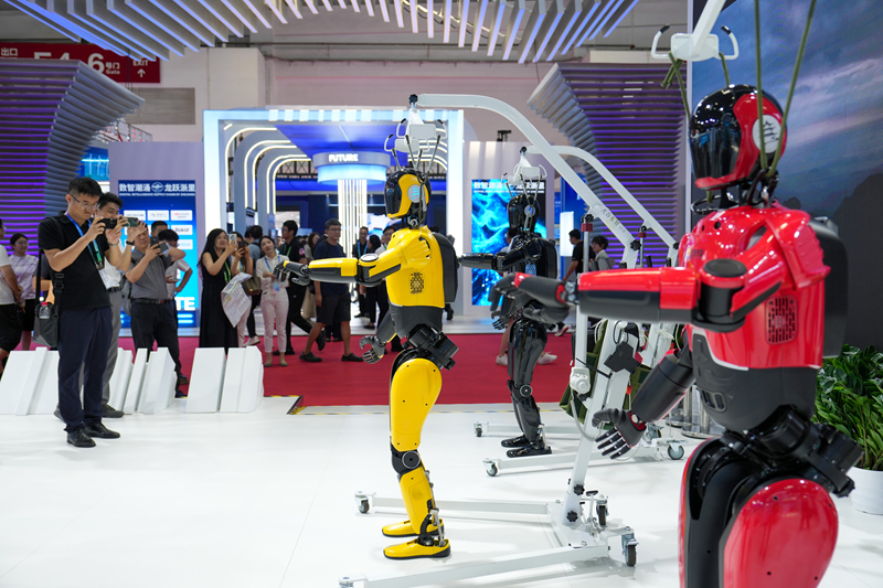 7月17日,在數(shù)字科技鏈展區(qū),參觀者觀看人形機器人表演。