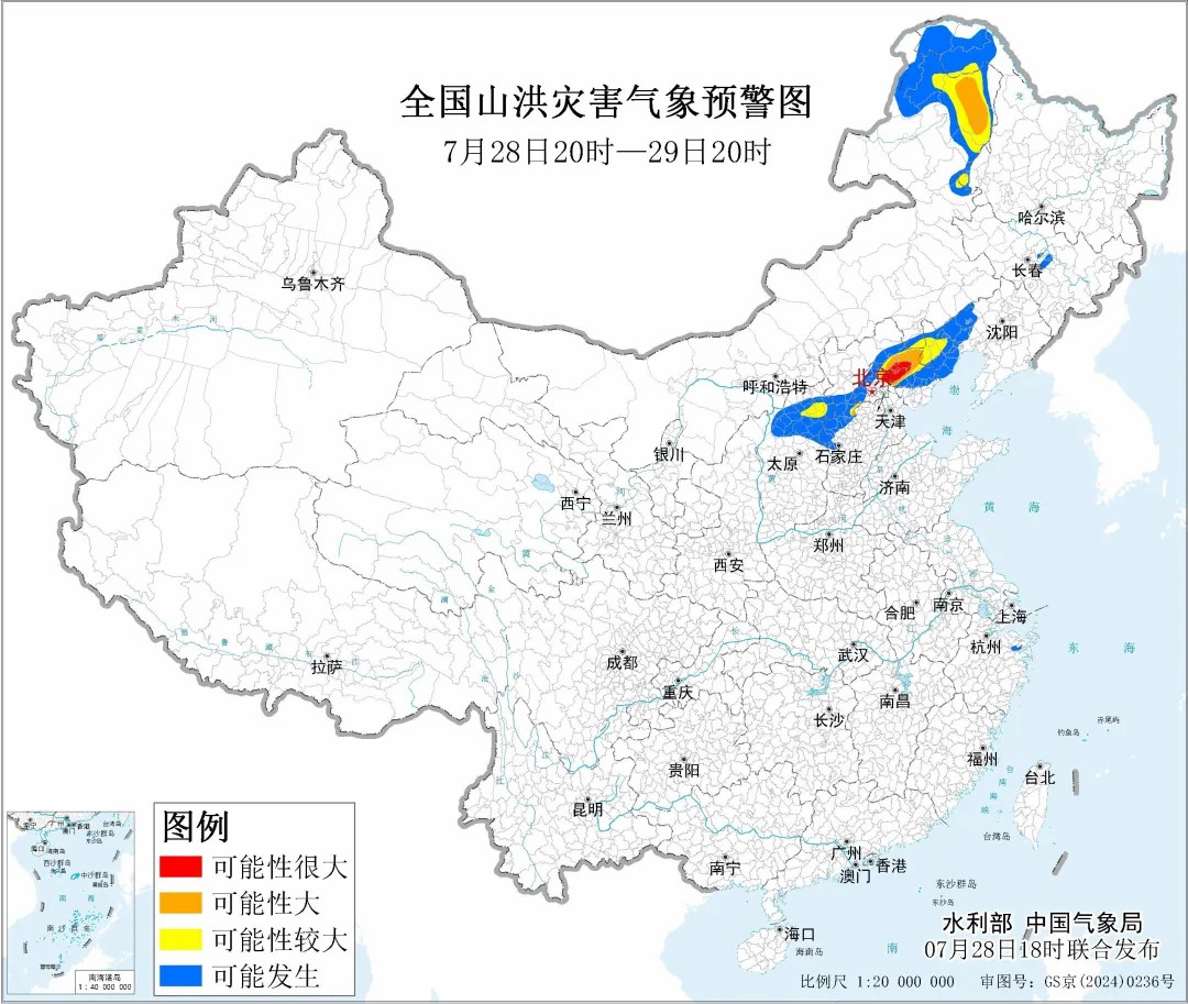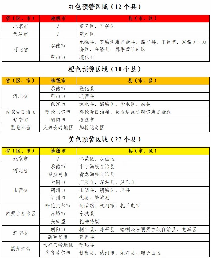 據(jù)“中國水利”微信公眾號消息,水利部和中國氣象局7月28日18時聯(lián)合發(fā)布紅色山洪災(zāi)害氣象預(yù)警:預(yù)計,7月28日20時至7月29日20時,北京東部、天津北部、河北中部和東北部、內(nèi)蒙古東北部、遼寧西部、黑龍江西部等地部分地區(qū)發(fā)生山洪災(zāi)害可能性大(橙色預(yù)警),其中,北京東部、天津北部、河北東北部局地發(fā)生山洪災(zāi)害可能性很大(紅色預(yù)警),預(yù)警區(qū)域涉及的縣(市、區(qū))見下表。其他地區(qū)也可能因局地短歷時強降水引發(fā)山洪災(zāi)害,請各地注意做好實時監(jiān)測、防汛預(yù)警和轉(zhuǎn)移避險等防范工作。