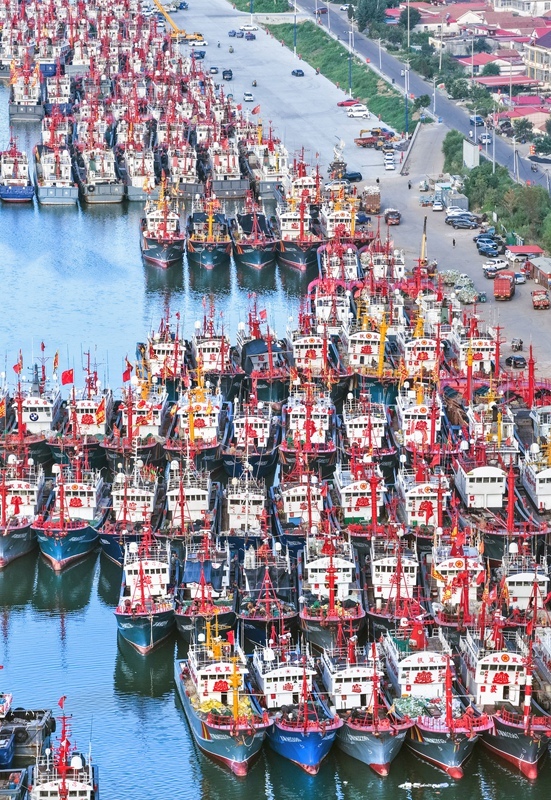7月30日,漁船停泊在江蘇省連云港市贛榆區(qū)青口中心漁港,躲避臺風(無人機照片)。