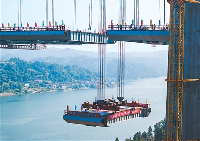 8月3日,由湖南路橋建設(shè)集團(tuán)承建的張官高速控制性工程洞庭溪沅水特大橋主橋順利合龍,為2026年全線通車奠定堅(jiān)實(shí)基礎(chǔ)。張官高速公路北起張家界市永定區(qū),南至懷化市沅陵縣官莊鎮(zhèn),是國家高速公路網(wǎng)呼和浩特—北海高速公路的重要組成部分。圖為大橋施工現(xiàn)場,一塊鋼混結(jié)合梁在被緩緩提升。新華社記者 陳思汗攝
