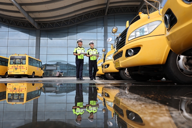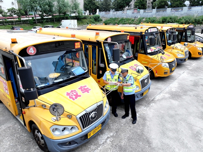 8月25日,江蘇省淮安市公安局洪澤分局交警大隊(duì)民警對(duì)校車(chē)進(jìn)行安全檢查。