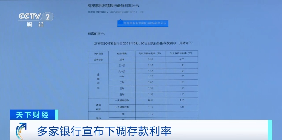 8月20日,山東省高密惠民村鎮(zhèn)銀行公告,個人定期存款6個月、1年期、2年期的年利率均下調10個基點,3年期、5年期則下調20個基點。
