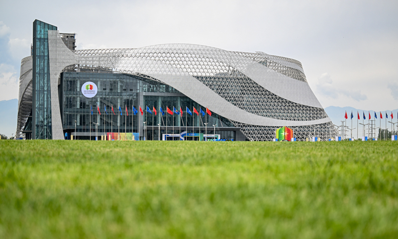 這是8月28日在寧夏銀川市拍攝的第七屆中國—阿拉伯國家博覽會(huì)開幕式舉辦地——寧夏國際會(huì)堂外景。