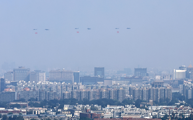 9月3日,紀(jì)念中國人民抗日戰(zhàn)爭暨世界反法西斯戰(zhàn)爭勝利80周年大會在北京隆重舉行。這是空中護(hù)旗梯隊。