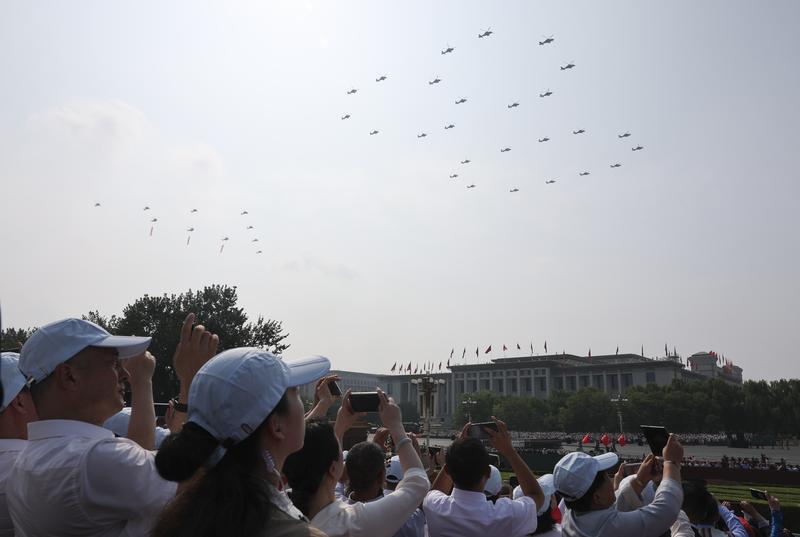 9月3日,紀念中國人民抗日戰(zhàn)爭暨世界反法西斯戰(zhàn)爭勝利80周年大會在北京隆重舉行。這是空中護旗梯隊。